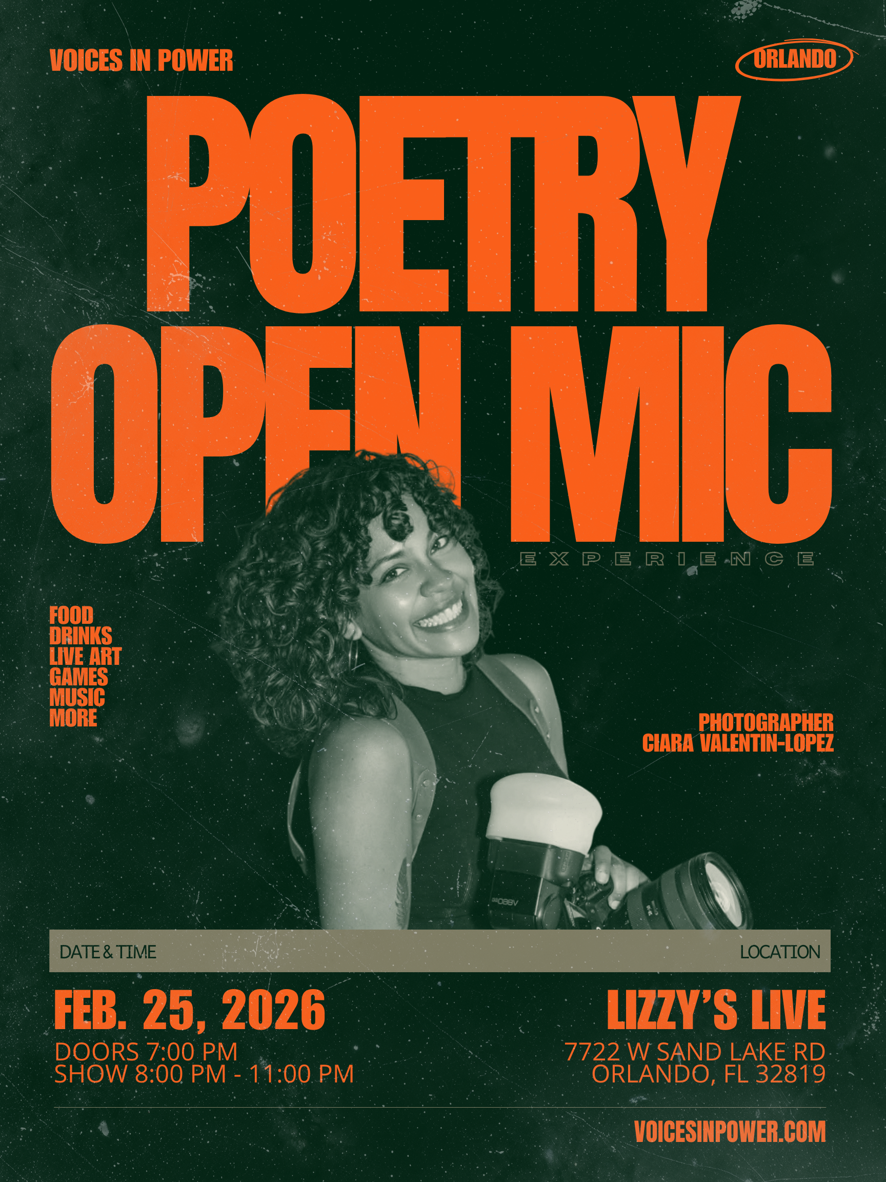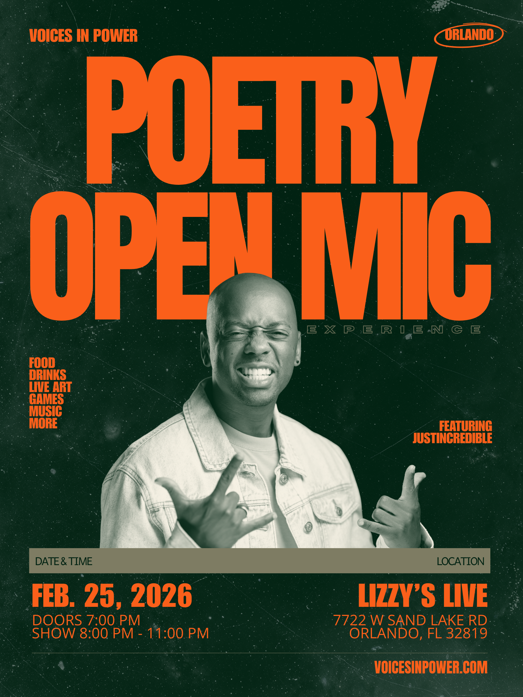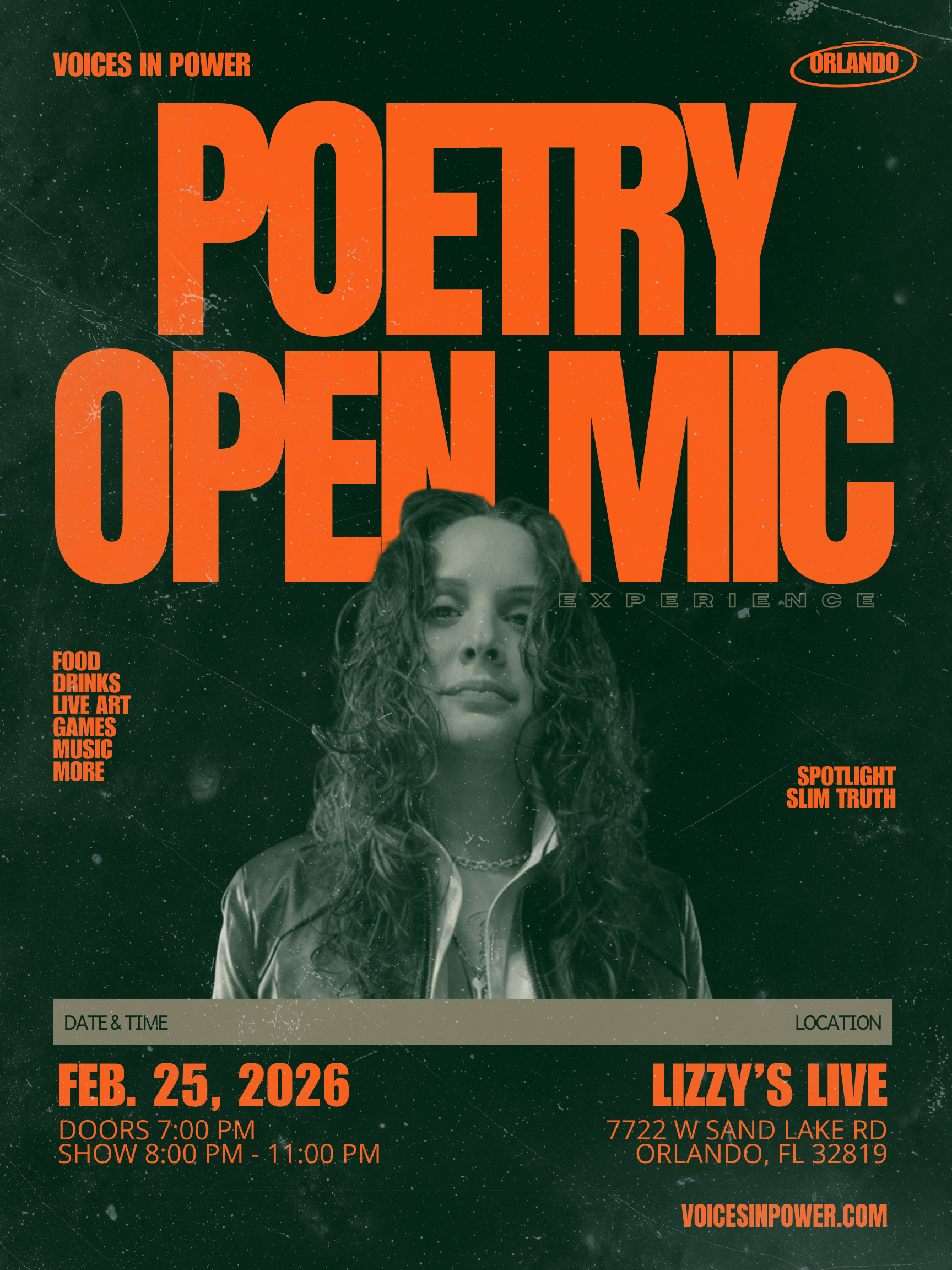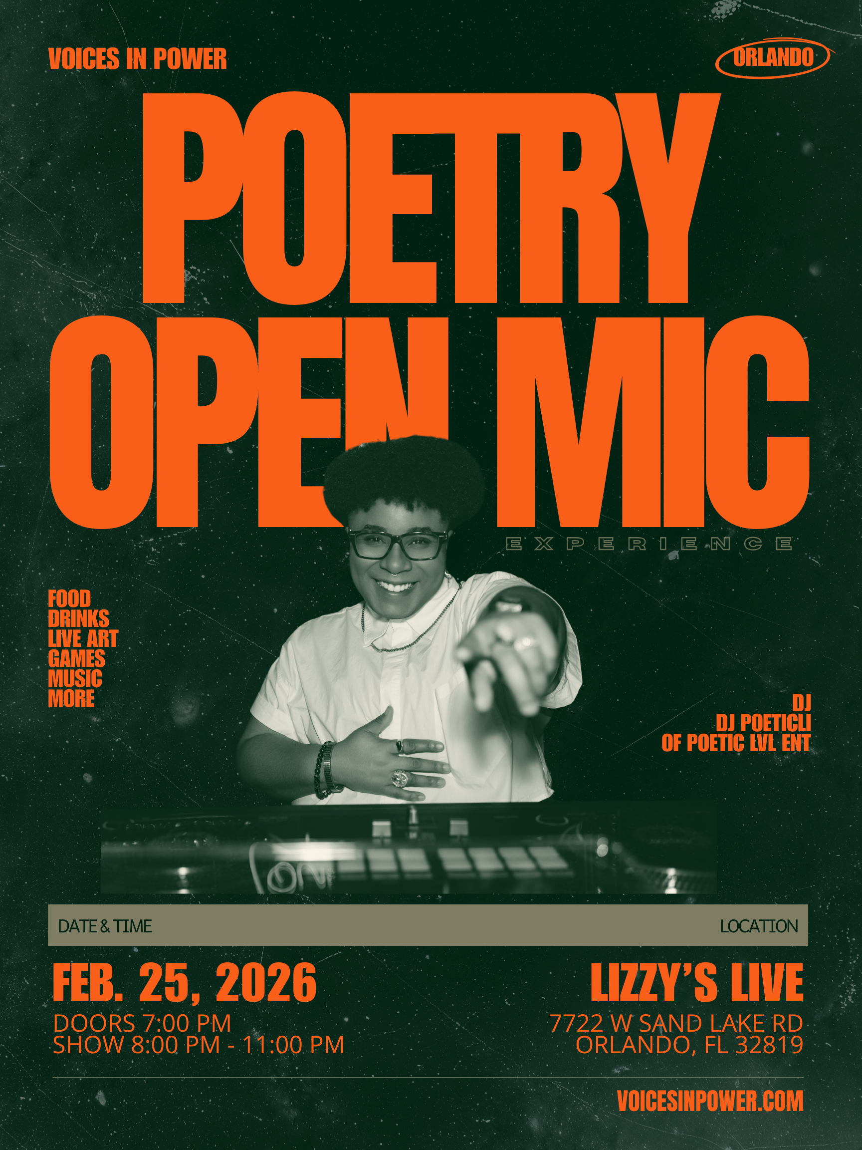 Voices In Power is bringing our Poetry Open Mic Experience to Orlando for the first time, & we’re doing it the only way we know how.. intentional, elevated, & rooted in community. We can’t wait to see you there.