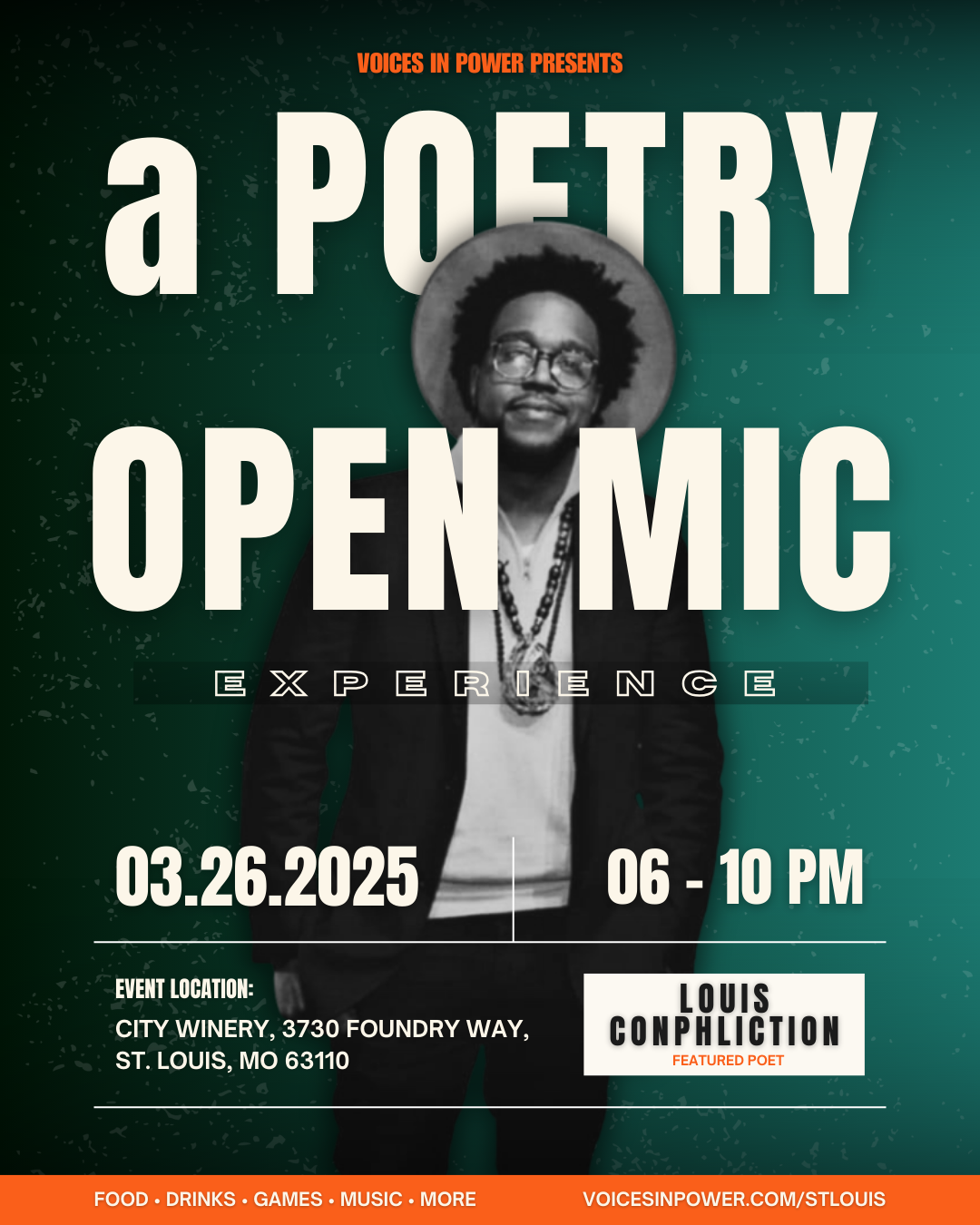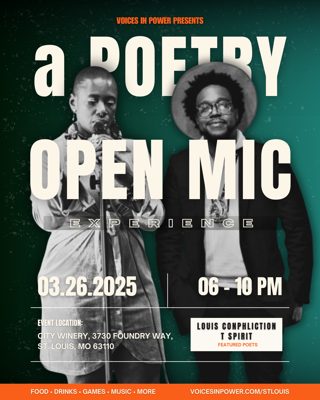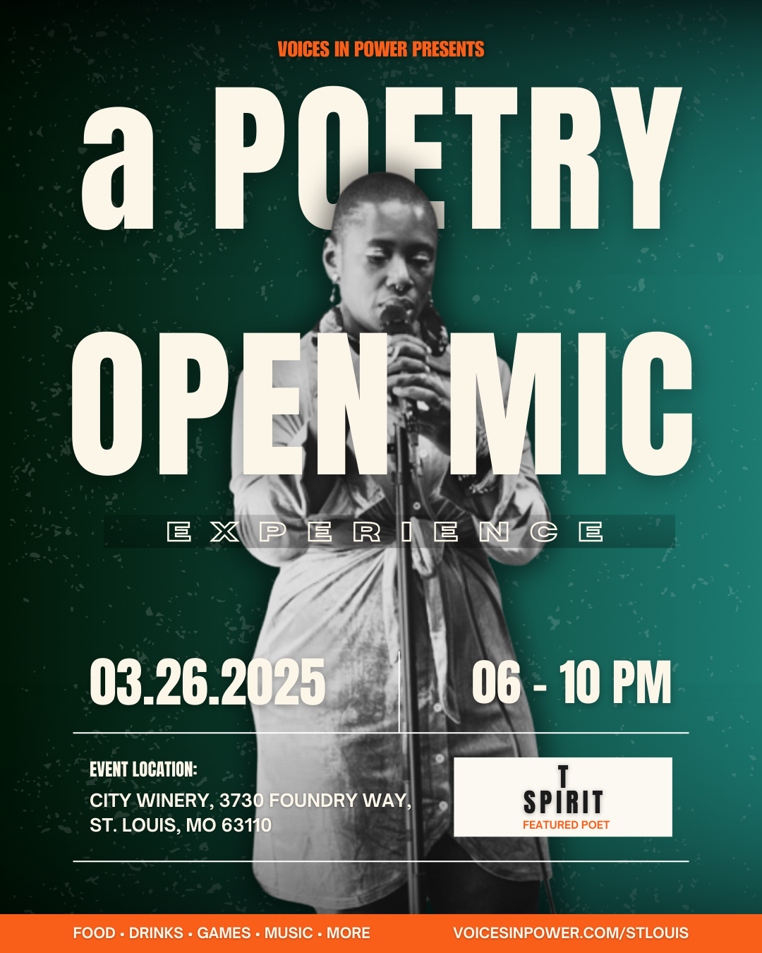 It’s time for another unforgettable stop in our Poetry Open Mic Experience TOUR with Voices In Power & this time we’re in St. Louis. This isn’t your average open mic— this is where poetry meets vibes, & the energy is unmatched.